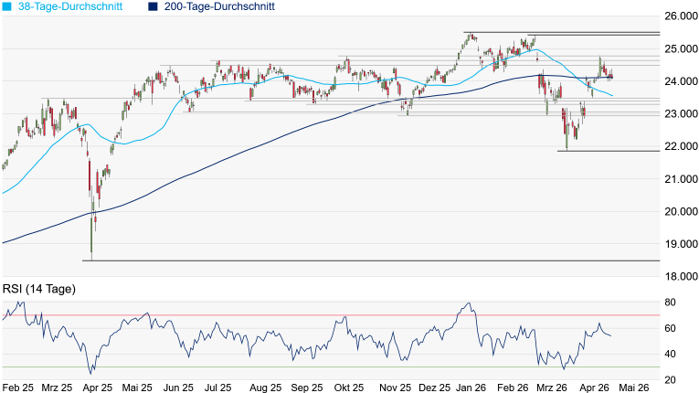 Unterseite zunächst weiteres Korrekturpotenzial bis zur aktuell bei 23.551 Punkten verlaufenden 38-Tage-Linie eröffnet. Danach wäre das Doppeltop vom März bei 23.476 Punkten auch nicht mehr weit. Ein Unterschreiten des Doppeltops könnte durchaus Verkaufsdruck erzeugen. Auf der Oberseite wäre eine Rückeroberung der 200-Tage-Linie wünschenswert. Entscheidend weiter aufhellen würde sich das Chartbild danach jedoch erst, wenn die Hochpunkte vom Juni bei 24.479 Punkten, Juli bei 24.639