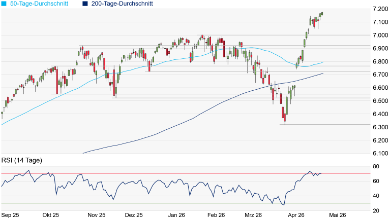 sollte. Kommt es zu Gewinnmitnahmen, trifft der S&P 500 jedoch erst am jüngsten Ausbruchsniveau bei 7.002 Punkten auf die nächste markante Unterstützung - das Hoch vom 28. Januar. Etwas gravierender eintrüben würde sich das kurzfristige Chartbild, wenn auch das Oktober-Hoch bei 6.920 Punkten unterschritten wird.
