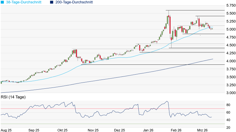 angesteuert werden. Zuvor würde sich noch das Dezember-Hoch bei 4.550 Dollar in den Weg stellen. Das übergeordnete Chartbild würde sich jedoch erst gravierend eintrüben, wenn auch das Oktober-Hoch bei 4.380 Dollar unterschritten wird. Auf der Oberseite würde das Kaufinteresse hingegen wohl erst wieder spürbar zunehmen, wenn das März-Hoch bei 5.417 Dollar überschritten wird. Das Rekordhoch vom Januar bei 5.594 Dollar wäre dann auch nicht mehr weit.