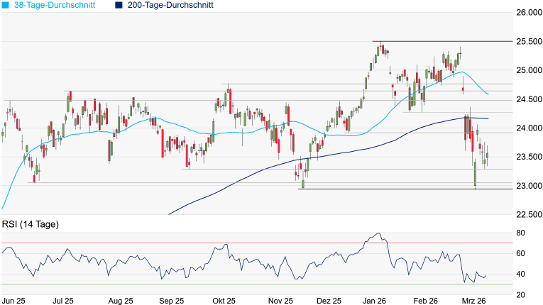 Hindernisse in den Weg stellen, die wohl nur bei einer Deeskalation im Nahost-Konflikt zu meistern wären. Auf der Unterseite ist die Gefahr jedoch noch längst nicht gebannt. Wird das September-Tief bei 23.285 Punkten unterschritten, würde sich bis zum Korrekturtief vom November bei 22.943 Punkten nur noch das Juni-Tief bei 23.052 Punkten in den Weg stellen.