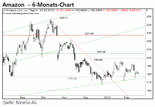 Ausblick: Zwischen 177,10 USD und 199,66 USD sind die Aktien von Amazon als neutral zu werten. Zwar könnte es jetzt zu einer etwas unorthodoxen Bodenbildung und einem Wiederanstieg kommen, doch sollte der Kräfteüberhang der Bären nicht aus den Augen verloren werden. Die Short-Szenarien: Sollte sich der kurzfristige Kursrutsch der laufenden Woche fortsetzen und so einen Bruch der Unterstützung bei 177,10 USD auslösen, wäre die aktuelle Konsolidierung aus unserer Sicht beendet. In der Folge dürften die Aktien von Amazon zunächst bis 170,00 USD zurückfallen. Wird diese Marke ebenfalls nachhaltig durchbrochen, sind weitere Verluste bis 160,00 USD wahrscheinlich. Entsprechend könnte man diesen Rückfall „short“ handeln. Auf mittlere Sicht wäre unterhalb von 160,00 USD von einer weiteren Verkaufswelle bis 145,00 USD auszugehen. Die Long-Szenarien: Sollte der Wert dagegen über die kleinere Barriere bei 188,00 USD ansteigen, kann es zu einer Zwischenerholung bis 199,66 USD kommen. Allerdings wäre erst der Ausbruch über diesen Widerstand bullish zu werten und könnte Folgekäufe bis 205,00 USD und darüber bis auf 220,00 USD auslösen. Diesen Anstieg könnte man entsprechend mit einem Longengagement handeln.