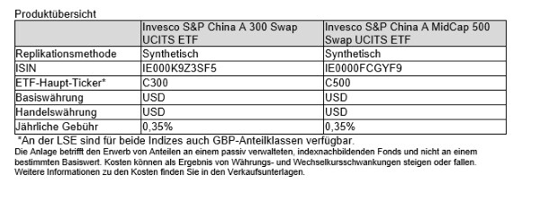 Ganz neu können Anlegerinnen und Anleger nun zwei ETFs nutzen, die die Wertentwicklung der grössten chinesischen Unternehmen bzw. chinesischer Mid-Cap-Unternehmen abbilden. Der Invesco S&P China A 300 Swap UCITS ETF und der Invesco S&P China A MidCap 500 Swap UCITS ETF können beide von den potenziellen strukturellen Vorteilen profitieren, die sich aus dem synthetischen Replikationsmodell des Unternehmens ergeben.