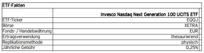 Um die Wertentwicklung des Index abzubilden, erwirbt der Invesco Nasdaq Next Generation UCITS ETF alle im Index enthaltenen Aktien, gewichtet diese entsprechend ihres Indexgewichts und folgt den Anpassungen am Referenzindex bei dessen regelmässiger Neugewichtung. Die jährlichen Gebühren (OCF) des ETF belaufen sich auf 0,25%. Anleger können zwischen USD- und GBP-Anteilsklassen wählen. Alle Dividendeneinkünfte werden automatisch wiederangelegt.