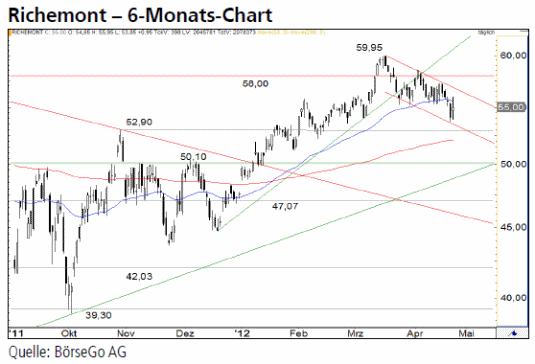 Ausblick: Nach dem steilen Anstieg seit Januar haben sich die Aktien eine Auszeit verdient und korrigieren diese Bewegung in Form einer bullishen Flagge. Bei 52,90 CHF treffen sie dabei auf eine solide Unterstützung, von der sich der nächste Aufwärtsimpuls anbahnen könnte. Die Long-Szenarien: Ein weiterer Anstieg über den langfristigen Widerstand bei 58,00 CHF würde nach unserer Einschätzung nicht nur den Ausbruch im März untermauern. Zugleich würden die Aktien von Richemont damit die Korrektur beendet haben und ein Anstieg auf 60,00 CHF folgen. Wird das Hoch überschritten, sind Folgekäufe bis 66,00 und 70,00 CHF zu erwarten. Entsprechend könnte man einen Ausbruch über 60,00 CHF „long“ handeln. Die Short-Szenarien: Für eine Ausweitung und vor allem die zeitliche Ausdehnung der laufenden Korrektur würde hingegen erst der Bruch der wichtigen Unterstützung bei 52,90 CHF sprechen. Oberhalb dieser Marke befindet sich die Aktie aus unserer Sicht in einem absolut intakten Aufwärtstrend. Sollte sie unterschritten werden, sind zunächst Abgaben bis 50,10 CHF wahrscheinlich. Doch könnte bereits von dieser Marke der nächste Aufwärtsschub starten. Unterhalb von 50,10 CHF kann jedoch ein Ausverkauf bis 47,07 CHF einsetzen.