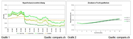 Die Angaben zu den Zinssätzen sowie zu den Zinskurven basieren auf den Richtzinssätzen von rund 65 Kreditinstituten, welche täglich aktualisiert und im Zinsüberblick von comparis.ch publiziert werden. Für die nachgefragten Laufzeiten werden die Finanzierungsgesuche ausgewertet, welche Kreditsuchende in der Hypotheken-Börse von comparis.ch platzieren. Die Interessenten erhalten von den Anbietern individuell für sie erarbeitete Angebote. Die Erfahrung zeigt, dass in den meisten Fällen die Zinsen der Hypothekarofferten unter den offiziellen Richtsätzen liegen.
