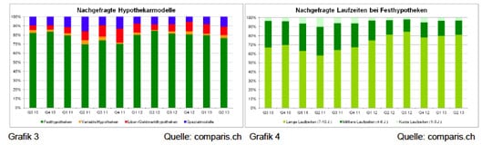 Zugelegt haben hingegen die Spezialmodelle, und zwar von 8 auf 11 Prozent sämtlicher Nachfragen. In diesen Angeboten gewähren die Banken Rabatte etwa für ökologisches Bauen, für Familien oder in einer Start-Hypothek. Ähnlich beliebt sind die Libor-Modelle; sie konnten mit 9 Prozent der Nachfrage ihren Marktanteil halten.