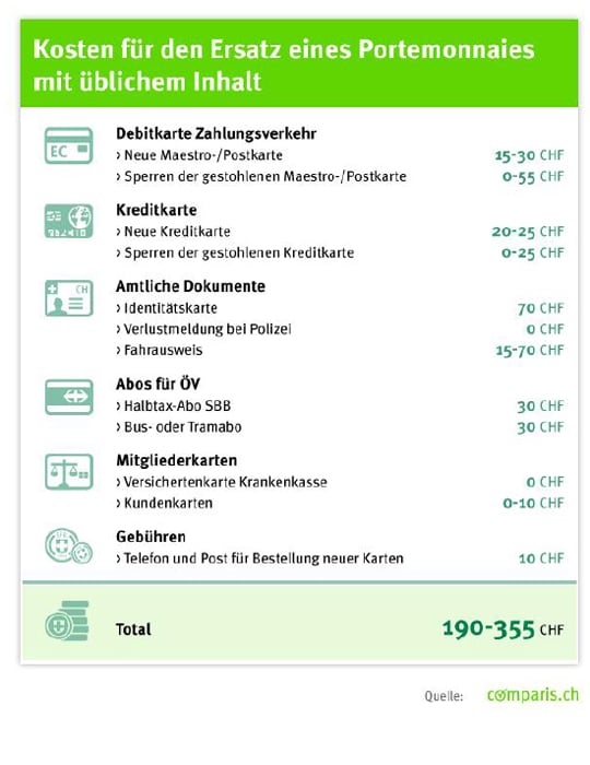Dies aus gutem Grund: Wenn das Portemonnaie gestohlen wird, ist nicht nur das Geld weg. Es entstehen auch happige Kosten, wenn man all die wichtigen Karten ersetzen muss. Der Internet-Vergleichsdienst comparis.ch hat für ein Portemonnaie mit üblichem Inhalt (siehe «**Berechnung») diese Kosten berechnet – und ist auf einen Betrag von 190 bis 355 Franken gekommen: