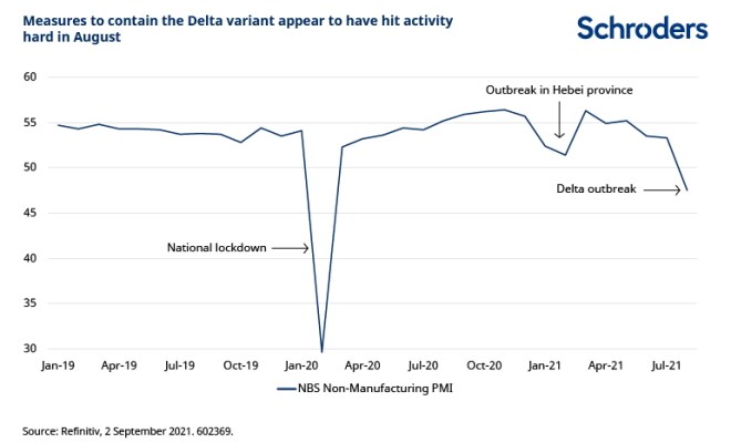 Die Konjunkturdaten blieben im Juli auf breiter Front hinter den Erwartungen zurück, und die jüngsten EMIs deuten darauf hin, dass die Konjunktur im August verhalten blieb. Im vergangenen Monat wurden die teilweisen Lockdowns zur Eindämmung von Covid-19 verschärft. Der NBS-EMI für das nicht verarbeitende Gewerbe ging nach einem Covid-19-Ausbruch stärker zurück als Anfang des Jahres. Die Produktion wurde ebenfalls unterbrochen, wozu auch Betriebsbeschränkungen in Ningbo, dem drittgrössten Seehafen der Welt, zählten.