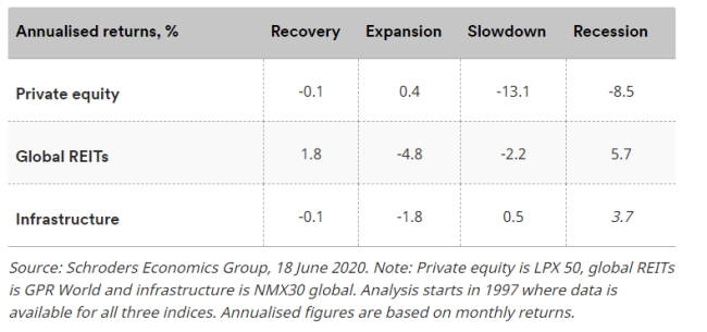 Most of the analysis looking at the performance of markets based on the economic cycle has been concentrated in the traditional asset classes. Similar examination of alternative assets is partly hindered by the lack of back-history to measure the return profile over several cycles. Nonetheless, over the last 20 years, we find that listed global REITs and infrastructure deliver stronger returns relative to global equities during the recession phase. These steady, income generating parts of the market appear to be more resilient to the downturn in economic activity. In the recovery phase, there is less of a distinction between these listed alternatives compared to global equities.