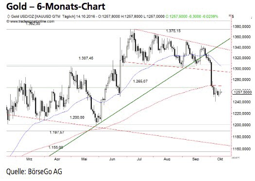 Jetzt informieren... auf die Ausbruchszone bei 1.307,45 USD zurückführte. Diese Unterstützung wurde im September bullish bestätigt. Der Goldpreis konnte sich jedoch nicht aus dem Trendkanal nach oben lösen. Nachdem der mittelfristige Aufwärtstrend durchbrochen wurde, ging es mit einer schnellen Ausverkaufsbewegung unter die Ausbruchszone bei 1.307,45 USD zurück. Zuletzt stabilisierte sich der Kursverlauf unter der 1.265,07 USD-Marke.