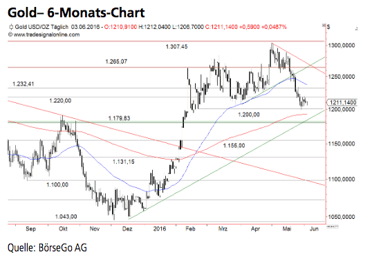 Rückblick: Die steile Kaufwelle beim Goldpreis, die von Dezember bis Ende April andauerte, ist in den letzten Tagen einer Korrektur gewichen. In der Spitze wurde zuvor fast der Widerstand bei 1.307,45 USD erreicht, ehe die aktuelle Talfahrt einsetzte.