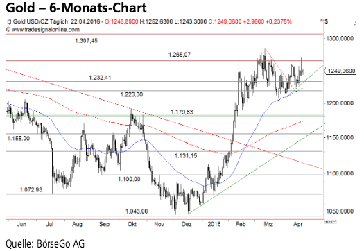 Rückblick: Mitte Dezember 2015 setzte sich bei Gold eine steile Kaufwelle im Bewegung, die das Edelmetall über die zentrale Widerstandsmarke bei 1.179,83 USD ausbrechen und bis an die Barriere bei 1.265,07 USD steigen liess.