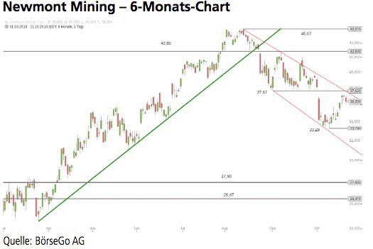 Jetzt informierenDie Notierungen bewegten sich daraufhin aus dem langfristigen Abwärtstrend und schafften einen Ausbruch über die bis zur 27,90 USD-Marke gegebene Widerstandszone. Der sich anschliessende Anstieg führte Newmont Mining über die 42,80 USD-Marke, bevor der Kaufdruck im August an der 46,07 USD-Marke zum Erliegen kam. Es folgten ein Ausbruch aus dem mittelfristigen Aufwärtstrend und der Übergang in eine Zwischenkorrektur. Zunächst konnte sich der Wert auf der 37,62 USD-Marke halten, durchbrach diese jedoch Anfang Oktober nach unten. Ausgehend von der 33,29 USD-Marke gelang zuletzt eine Erholung.