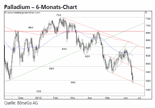 Jetzt informierenAusblick: Das Chartbild des Edelmetalls bleibt weiter angeschlagen. Kurzfristige Befreiungsversuche der Käuferseite verpuffen und die Bären gewinnen erneut die Überhand. Dieses Kräftegefälle dürfte sich nach unserer Einschätzung weiter fortsetzen. Die Short-Szenarien: Unterhalb der Widerstandsmarke bei 593,00 USD dürfte sich die laufende Verkaufswelle fortsetzen und zu einem Bruch der Unterstützung bei 560,00 USD führen. Sollte dies der Verkäuferseite gelingen, wären weitere Verluste bis 532,00 USD zu erwarten. An dieser Stelle könnte sich der Palladiumkurs leicht erholen. Von einem Ende des Abwärtstrends wäre damit jedoch noch nicht auszugehen. Vielmehr droht im Anschluss an eine solche Gegenbewegung der mittelfristige Rückfall unter 532,00 USD. Unterhalb dieser wichtigen Unterstützung sind weitere Verluste bis 475,00 USD möglich. Die Long-Szenarien: Sollte sich der Wert dagegen über den Widerstand bei 575,00 USD zurückarbeiten, dürfte eine kurzfristige Erholung bis 593,00 USD einsetzen. An dieser Marke wäre bereits wiederum mit Abgabedruck zu rechnen. Würde dieser Widerstand jedoch nachhaltig gebrochen, könnte sich eine Erholung bis 623,00 USD und darüber bis 644,00 USD vollziehen. Die auf diesem Kursniveau verlaufende mittelfristige Abwärtstrendlinie dürfte aus unserer Sicht jedoch für ein vorübergehendes Ende dieser Aufwärtsbewegung sorgen. Nach unserer Einschätzung wäre der Abwärtstrend der letzten Monate erst oberhalb von 644,00 USD überwunden.
