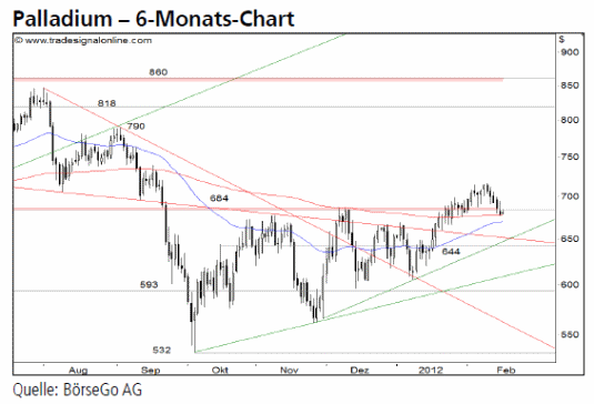 Jetzt informierenAusblick: Nach unserer Einschätzung wäre ein nachhaltiger Rückfall unter die 684,00 USD-Marke ein Zeichen für einen Fehlausbruch nach oben. Eine deutliche Korrektur könnte dem folgen. Die Short-Szenarien: Verbleibt Palladium unterhalb der breiten Widerstandszone zwischen 684,00 und 715,00 USD, wäre zunächst eine Korrektur bis 644,00 USD zu erwarten. Von dort aus könnte es zu einem weiteren Anstieg bis 684,00 USD kommen. Wird die Unterstützung bei 644,00 USD hingegen unterschritten, würden deutlichere Abgaben bis 593,00 USD drohen. Einen Rückfall unter diese Marke könnte man „short“ handeln und somit auf einen Ausverkauf bis 532,00 USD spekulieren. Die Long-Szenarien: Erst ein Ausbruch über 715,00 USD auf Tagesschlusskursbasis würde derzeit nach unserer Auffassung ein tragfähiges Longsignal generieren. In diesem Fall wäre eine mehrtägige Aufwärtsbewegung bis 750,00 und 760,00 USD wahrscheinlich. Oberhalb dieser Widerstände wäre zudem eine Hausse bis 790,00 USD denkbar.