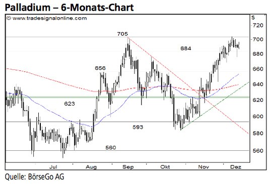 Rückblick: Palladium erreichte Mitte September innerhalb einer steilen Aufwärtsbewegung den Widerstand bei 705,00 USD. Doch so schnell die Bullen...