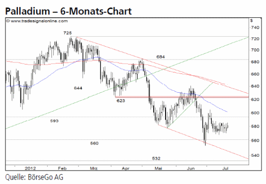 Jetzt informierenAusblick: Der Abwärtstrend des Wertes könnte in den nächsten Tagen fortgesetzt werden. Aus der aktuellen Seitwärtsphase bereits eine Bodenbildung abzuleiten, erscheint uns verfrüht. Die Short-Szenarien: Fällt Palladium unter 560,00 USD, wäre der Seitwärtsmarkt beendet und es dürfte demzufolge eine weitere Abwärtswelle bis an die wichtige Unterstützung bei 532,00 USD einsetzen. Auf dem Niveau des Tiefs aus dem Oktober 2011 wäre mit einer Stabilisierung und einem leichten Wiederanstieg zu rechnen. Sollte diese Marke jedoch im weiteren Verlauf unterschritten werden, wäre ein übergeordnetes Verkaufssignal aktiv, welches sich in einem starken Kursrückgang bis 500,00 USD äussern dürfte. Darunter könnte sich die Verkaufswelle bis 475,00 USD ausdehnen. Die Long-Szenarien: Ein Anstieg über die Widerstände bei 585,00 und 593,00 USD könnte dagegen eine Erholung bis zur mittelfristigen Abwärtstrendlinie auslösen. Diese verläuft aktuell auf Höhe des Widerstands bei 623,00 USD. Doch erst ein Ausbruch über diese Hürde spräche für ein Ende des Ausverkaufs.