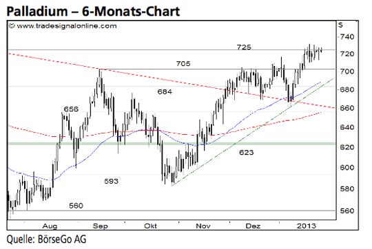 Sollte das Dreieck nach oben hin aufgelöst werden, stünde einer Ausweitung der aktuellen Rally nach unserer Auffassung nichts mehr im Wege. Die Long-Szenarien: Bei Kursen oberhalb von 735,00 USD hätte Palladium ein weiteres Kaufsignal ausgebildet, welches man entsprechend „long“ handeln könnte. In der Folge wäre mit einem Anstieg bis 750,00 und 762,00 USD zu rechnen. Sollte auch diese Marke durchbrochen werden, könnte sich der Anstieg auf mittlere Sicht bis 790,00 USD fortsetzen. Die Short-Szenarien: Käme es jetzt da- gegen zu einer Korrektur, würde diese zunächst für Abgaben bis zur Haltemarke bei 705,00 USD sorgen. Dort könnte sich ein weiterer Anstieg anbahnen. Erst ein nachhaltiger Bruch der Marke würde für eine umfangreichere Gegenbewegung sprechen, die Palladium bis 684,00 USD zurückführen dürfte. Allerdings hat auch diese Unterstützung das Potential, einen weiteren Kaufimpuls auszulösen. Erst darunter käme es zu einem starken Ausverkauf bis 656,00 USD.