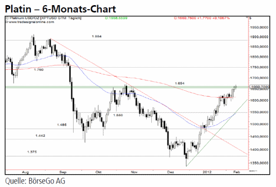 Ausblick: Mit dem Anstieg an die 1.654 USD-Marke erzwingen die Bullen in Platin eine mittelfristige Richtungsentscheidung, deren Ausgang aus unserer Sicht jedoch offen ist. Die Long-Szenarien: Bei einem Ausbruch über 1.654 USD auf Tagesschlusskursbasis würde ein Kaufsignal generiert, welches man entsprechend mit einem Longengagement handeln könnte. Um das Risiko eines Fehlausbruchs gering zu halten, sollte man diese Position nach unserer Auffassung im Bereich von 1.600 USD mit einem Stoploss absichern. Im Anschluss könnte eine weitere Kaufwelle zu einem Anstieg bis 1.750 USD führen. Dort wäre eine mittelfristige Korrektur zu erwarten. Jedoch hätte sich der Wert mit dem erfolgreichen Ausbruch über 1.654 USD generell auf mittlere Sicht weiteres Aufwärtspotential bis 1.820 und 1.884 USD geschaffen. Die Short-Szenarien: Scheitern die Käufer dagegen am Widerstand bei 1.654 USD, kann eine erste Korrektur bis 1.620 und 1.600 USD einsetzen. Von dort aus könnte sich jedoch bereits der nächste Ausbruchsversuch vollziehen. Ein Rückfall unter 1.600 USD hätte dagegen eine ausgeprägtere Korrektur bis 1.550 USD zur Folge. Selbst hier könnten die Bullen erneut in das Geschehen eingreifen und eine zweite übergeordnete Kaufwelle auslösen. Ein Bruch dieser Marke wäre dagegen ein Indiz für eine anhaltende Marktschwäche, die man entsprechend „short“ handeln könnte. In der Folge könnte Platin bis 1.442 und 1.375 USD zurückfallen.