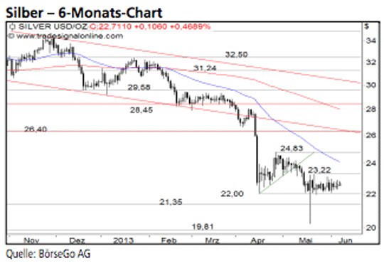 Jetzt informierenAusblick: Der Silberpreis wirkt in den vergangenen Tagen, als sei er in eine Schockstarre verfallen. Dies sollte jedoch aus unserer Sicht zur Vorsicht mahnen. Ein Ausbruch aus der derzeitigen Seitwärtsspanne dürfte eine rasche, massive Trendbewegung nach sich ziehen. Die ShortSzenarien: Bricht Silber unter 22,00 USD ein, sollte der Wert von einer weiteren Verkaufswelle erfasst und in Richtung des Unterstützungsbereichs bei 21,35 USD ausverkauft werden. Darunter dürfte sich dieser Kurseinbruch bis 20,20 USD und auf mittlere Sicht bereits bis 19,81 USD fortsetzen. Die LongSzenarien: Gelingt es den Bullen dagegen den Korridor nach oben zu durchbrechen und den Widerstand bei 23,22 USD zu überwinden, wäre eine ebenso starke Trendbewegung in Richtung 24,00 USD die Folge. Kann daraufhin auch diese Hürde überschritten werden, sind Zugewinne bis 24,83 USD zu erwarten. An dieser Stelle entscheidet sich die mittelfristige Zukunft des Edelmetalls: Ein Ausbruch über die Barriere könnte eine Kaufwelle bis 26,40 USD bedingen. Ein Scheitern an der Hürde dürfte dagegen zu Abgaben bis 23,30 USD führen.