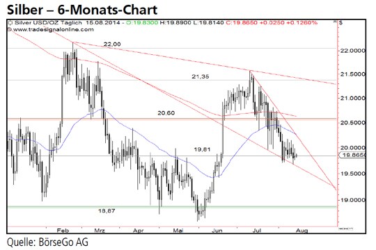 Jetzt informierenVon dort stieg der Wert im Juni an den Widerstand bei 21,35 USD an, konnte diesen jedoch nicht durchbrechen. Mit dem Rückfall unter die Unterstützung bei 20,60 USD kam es Anfang August zu einem Einbruch bis zur Haltemarke bei 19,81 USD. Diese markante Unterstützung versuchen die Bullen in dieser Woche zu verteidigen und damit die Chancen auf einen weiteren Anstieg zu wahren.