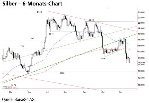 Jetzt informieren... eine Korrektur nach sich zog. Der mittelfristige Aufwärtstrend wurde bereits Anfang Oktober durchbrochen. Silber konnte sich darunter jedoch nochmals deutlich erholen. Nach der US Wahl drehten die Notierungen im Einzugsbereich des gebrochenen Aufwärtstrends wieder nachhaltig nach unten ab und markierten zuletzt innerhalb einer dynamischen Bewegung ein neues Zwischentief.
