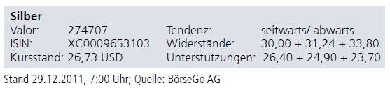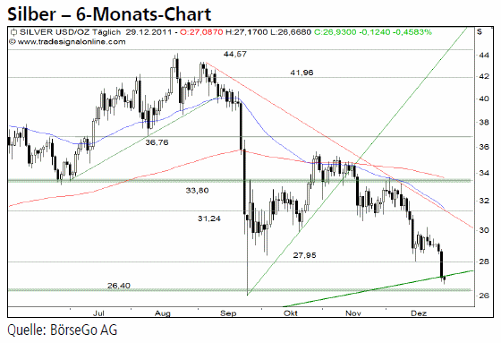 Rückblick: Silber scheiterte Mitte Dezember an der massivenWiderstandsmarke bei 33,80 USD und fiel direkt unter die Unterstützungbei 31,24 USD zurück.