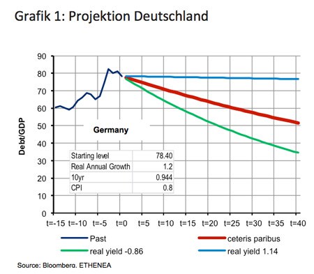 Für unsere Projektion nehmen wir zunächst an, dass die Staatshaushalte ausgeglichen sind. Ferner betrachten wir drei Szenarien: Als Hauptszenario gilt der Fortbestand des Status Quo, bezeichnet als ceteris paribus. Hier halten wir die aktuell beobachtete Wachstumsrate des BIP sowie die Realverzinsung der Schulden (10-jähriger Nominalzins abzüglich der jährlichen Konsumentenpreisinflationsrate) konstant. Dieses Szenario ist in den Grafiken rot hinterlegt. Ein weiteres Szenario bietet die Erhöhung des Realzinses um 1 % (blaue Linie). Im letzten Szenario haben wir die Daten des angeblichen Musterschülers Deutschland verwendet, also deutsche Realzinsen und BIP-Wachstumsraten (grüne Linie).
