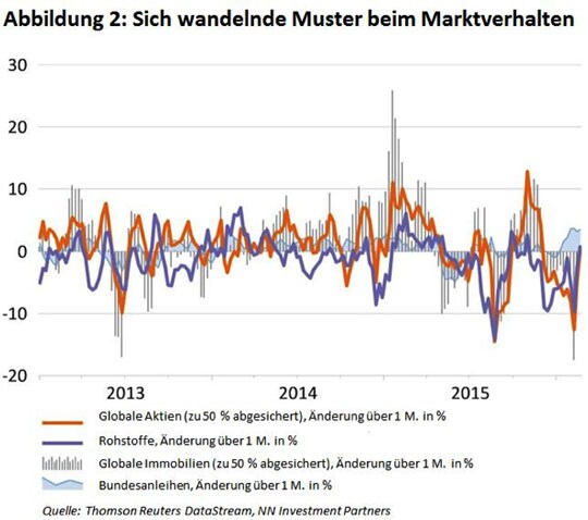 Entsprechend herrschte in den vergangenen zehn Monaten eine Verkaufsstimmung an den Märkten vor. Zunächst beschränkte sich diese Stimmung auf Assets mit hoher Zinssensitivität (Stichwort: Kurssturz bei Bundesanleihen) und die Sorge um einen Dominoeffekt aus Griechenland. Entsprechend schlecht schnitten globale Anleihen, Immobilien und europäische Aktien im zweiten Quartal 2015 ab. Im Sommer waren es dann wieder die Rohstoffmärkte und Märkte im Umkreis der EM, die von Kursrutschen betroffen waren, während Angst vor einer globalen Rezession im dritten Quartal die Aktien- und Immobilienmärkte belastete.
